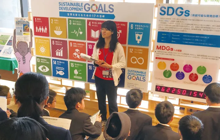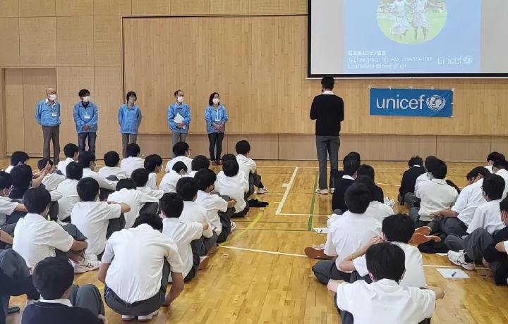 ユニセフ協会の方を本校に招いて、ワークショップを実施しています。ユニセフが取り組んでいる世界の様々な問題について意識を向け、私たちが直面している課題について学びます。特にSDGsとのつながりを知り、持続可能な世界を築くために、私たちが今、具体的に貢献できることについて考えます。