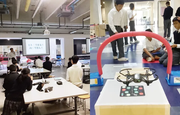 中学校では、土曜日の特別講座(希望者対象に年2回実施)でプログラミング教室が行われます。名電中学の技術教諭の指導により実施される名電独自の理系プログラムです。ドローンの制御を通じて、センサーやカメラを利用したプログラミングを学びます。また、AIなどのプログラミング技術に触れたり、エンジニアの人の話を聴いたりします。生徒たちは、プログラミング的思考を身につけるとともに、最先端のプログラミング技術に触れ、自分自身の将来について考える機会にもなります。