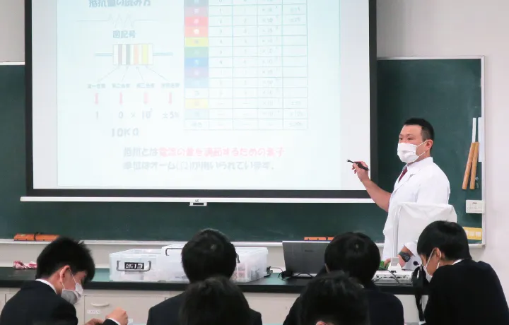 中学で行われるサイエンスラボを高校生向けに発展させたプログラム。一つひとつの電子部品の特徴を理解しながら進める講義です。講義では、光によって電気の流れ方が変わる電子部品を使って、周囲の明るさに応じて点灯や消灯する「光センサー」の製作に取り組みます。