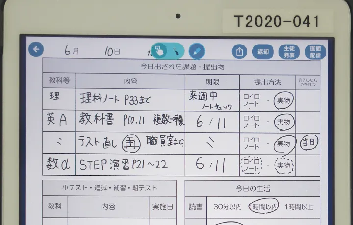 タブレットを用いて毎日の学習課題や生活状況などを記入。毎日行うことで規則正しい生活習慣を身につけます。「日記」の欄は担任の先生とのコミュニケーションに活用します。